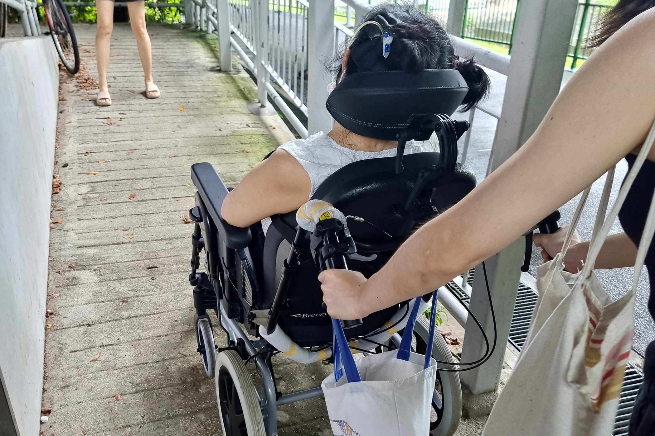 Checking how the canopy angle and coverage changes depending on the height of the person pushing the wheelchair, one of those details that only becomes obvious when you test it in person