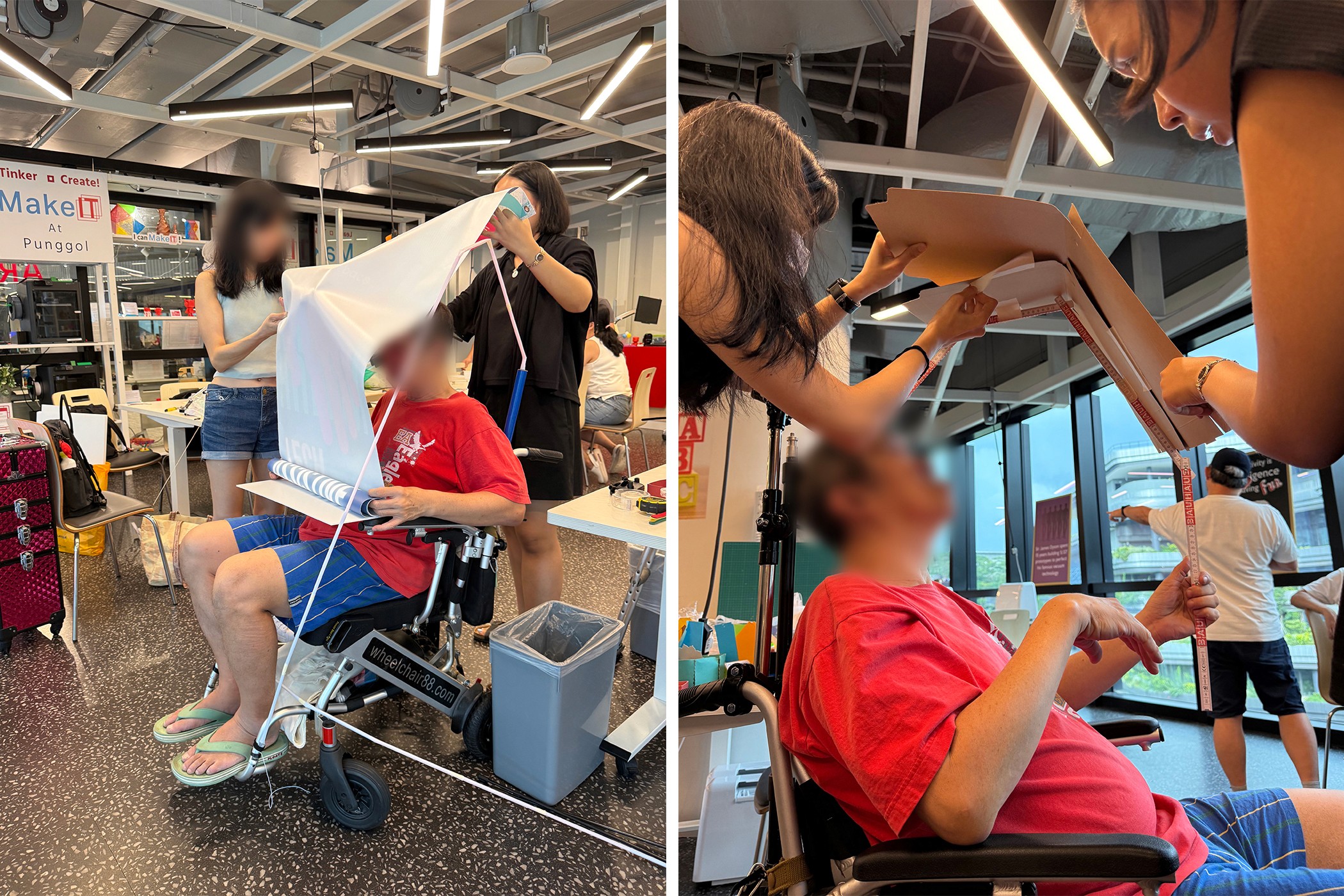One of our first canopy prototypes, held together with paper and plastic straws, being tested for size and coverage on a real wheelchair